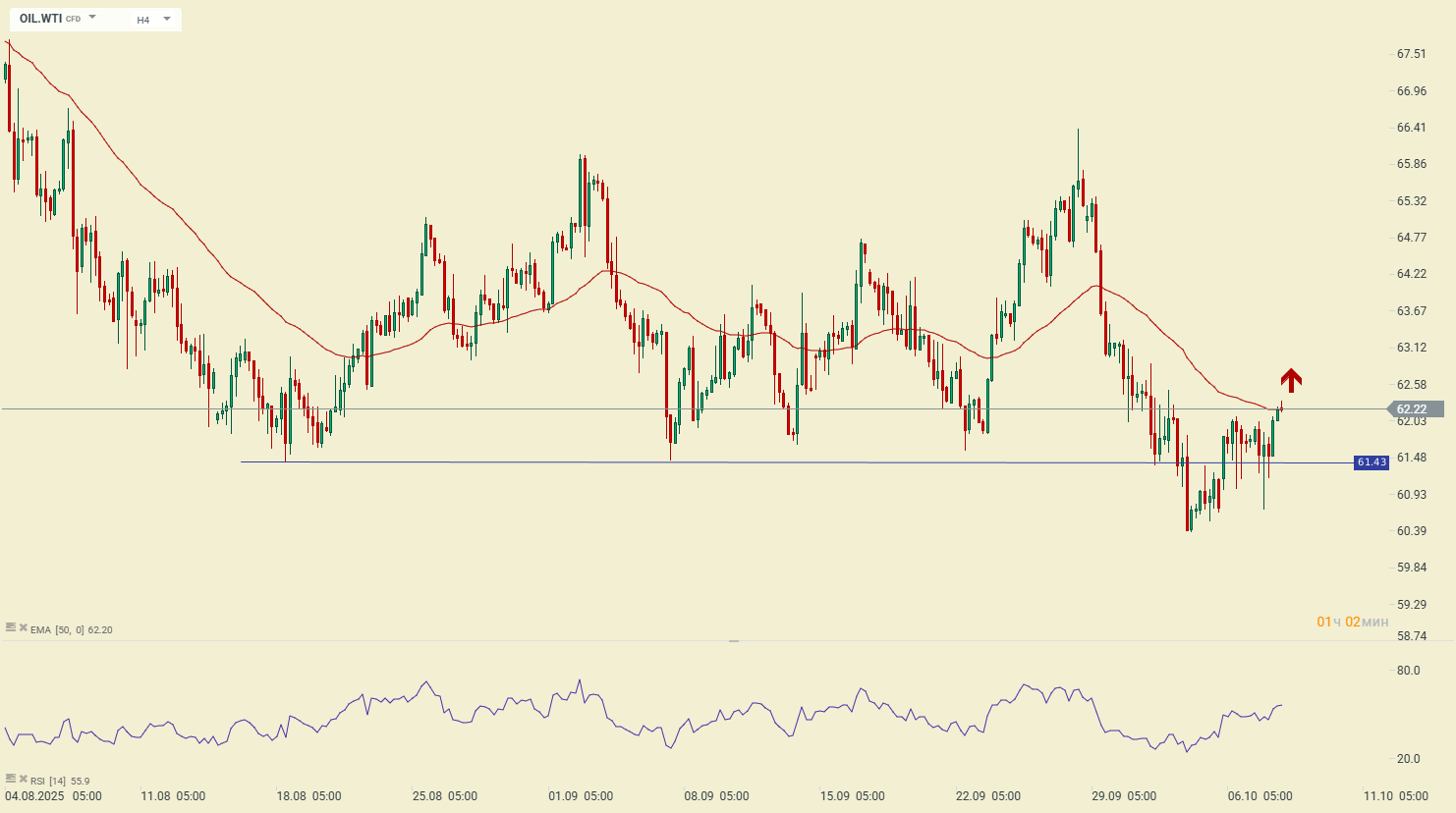 По нефти марки WTI (OIL.WTI) продолжается накопление выше ключевой поддержки. Удержание уровня поддержки в районе 61.40 в виде продолжительной консолидации выше указывает на сохранение перспективы роста нефти с ближайшими целями до максимумов сентября. Индикатор RSI отбился от зоны перепроданности и подтверждает рост. Исходя из этого, наша рекомендация по нефти марки WTI (OIL.WTI): покупка выше поддержки 61.40, с текущих либо после небольшого отката. Альтернативный сценарий: реакция вниз с закреплением ниже 61.40 на дневном таймфрейме будет означать отмену лонгового сценария.