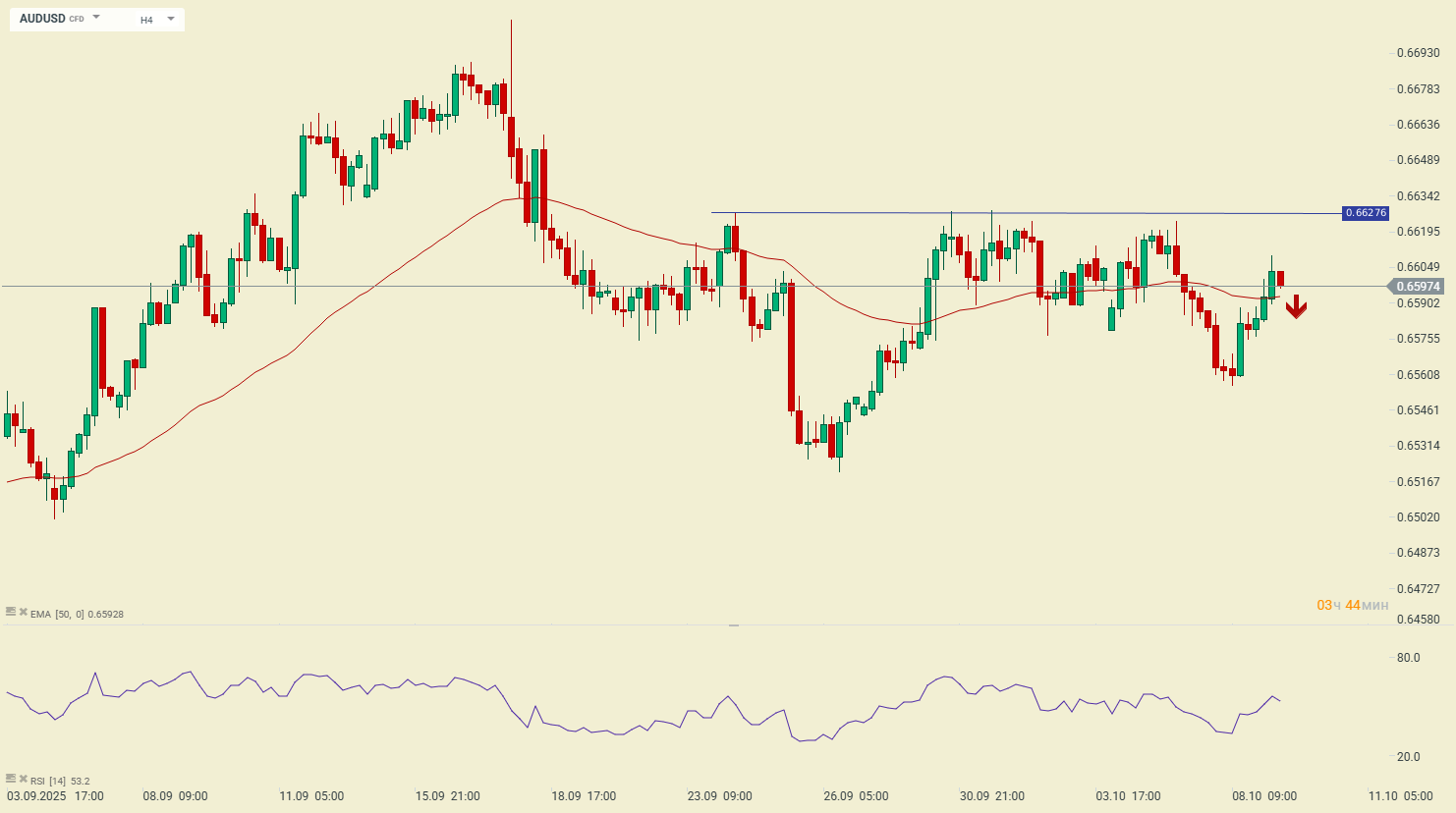 Валютная пара AUDUSD набирает позицию для коррекции вниз. Продолжительное удержание уровня сопротивления в районе 0.6627 указывает на перспективу коррекционных продаж. Индикатор RSI отбился от зоны перекупленности и подтверждает медвежье настроение данной валютной пары. Исходя из этого, наша рекомендация по AUDUSD: шорт ниже ключевого уровня сопротивления 0.6627 с ближайшей целью в районе 0.6530. Альтернативный сценарий: закрепление выше уровня 0.6627 будет означать продолжение трендового роста.