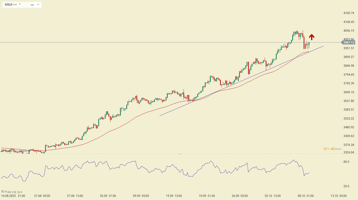 На графике золота GOLD подтверждается продолжение трендового роста. Удержание восходящей трендовой линии сигнализирует о накоплении позиции для роста в сторону долгосрочной лонговой тенденции. Цена торгуется выше 50 ЕМА, что указывает на рост. Исходя из этого, наша рекомендация по GOLD: покупка выше трендовой линии поджатия со следующей целью в районе 4200. Альтернативный сценарий: закрепление ниже восходящей трендовой линии откроет путь для коррекции вниз.