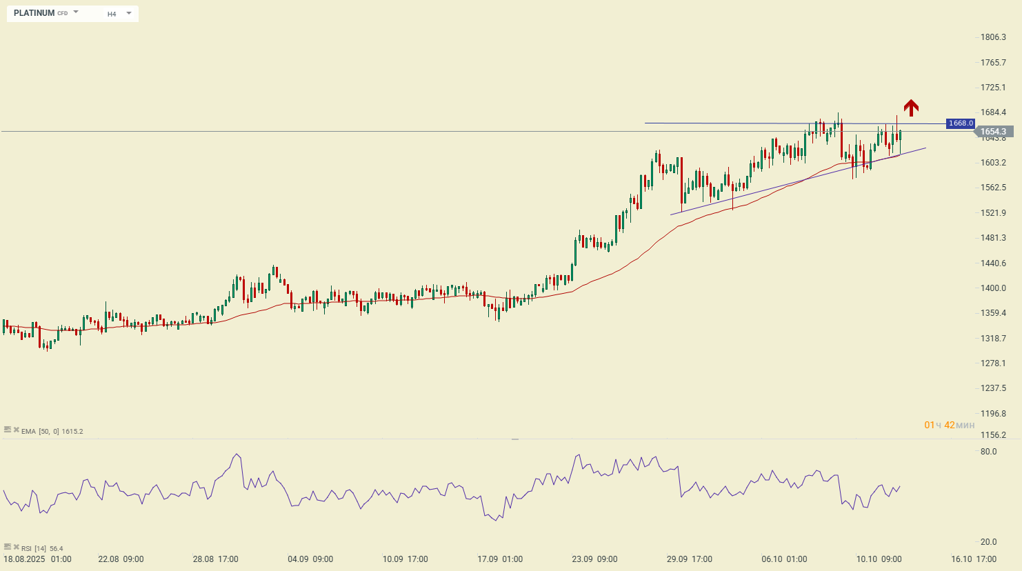 По платине PLATINUM сохраняются лонговые приоритеты. Фигура технического анализа "восходящий треугольник" с выраженным поджатием наверх указывает на готовность инструмента продолжать двигаться в лонг с перспективой прорыва верхней границы треугольника в районе 1668. Закрепление и консолидация выше 50 ЕМА подтверждает рост. Исходя из этого, наша рекомендация поPLATINUM: покупка на пробой сопротивления 1668 с целью 1800 и выше. Альтернативный сценарий: импульсная реакция вниз с пробитием нижней границы треугольника и закреплением ниже откроет путь для коррекционных продаж.