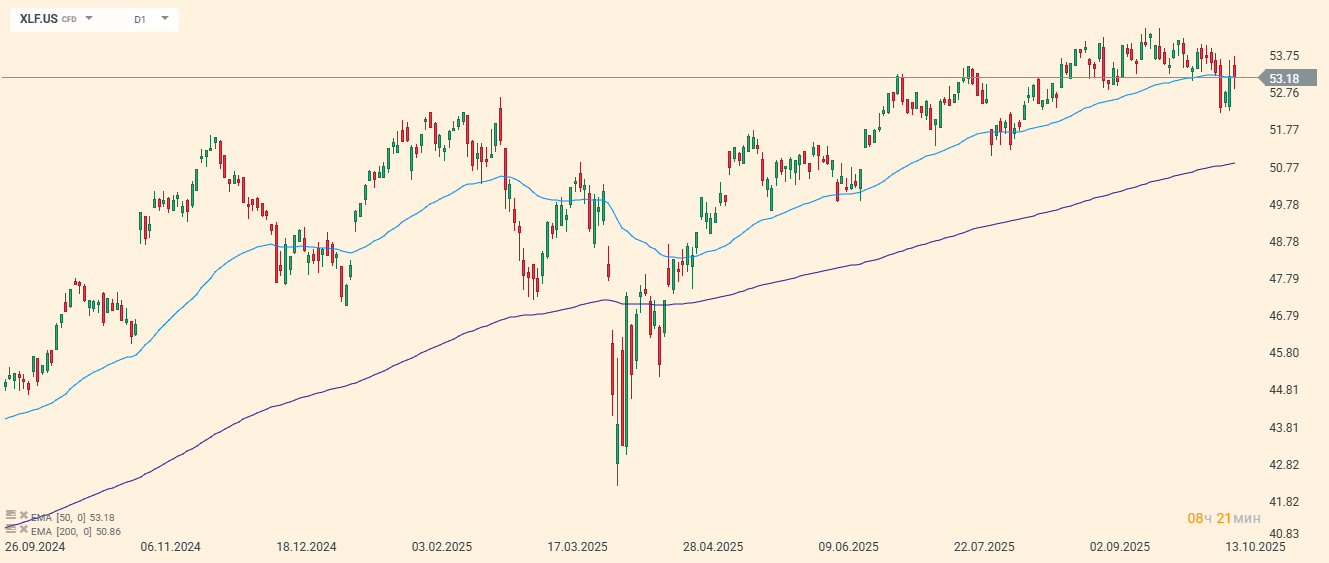 В целом, в III квартале 2025 года крупные банки США показали сильные результаты, превысив ожидания аналитиков. Комиссионные доходы, активность в сегменте M&A и на рынках капитала, а также торговые операции стали ключевыми драйверами роста. При этом базовые процентные доходы (NII) остаются основой, и банки, способные эффективно балансировать между процентным и комиссионным бизнесом, выигрывают. В целом сектор (представленный отраслевым биржевым фондом XLF) демонстрирует устойчивость и доверие рынка в условиях нестабильности.