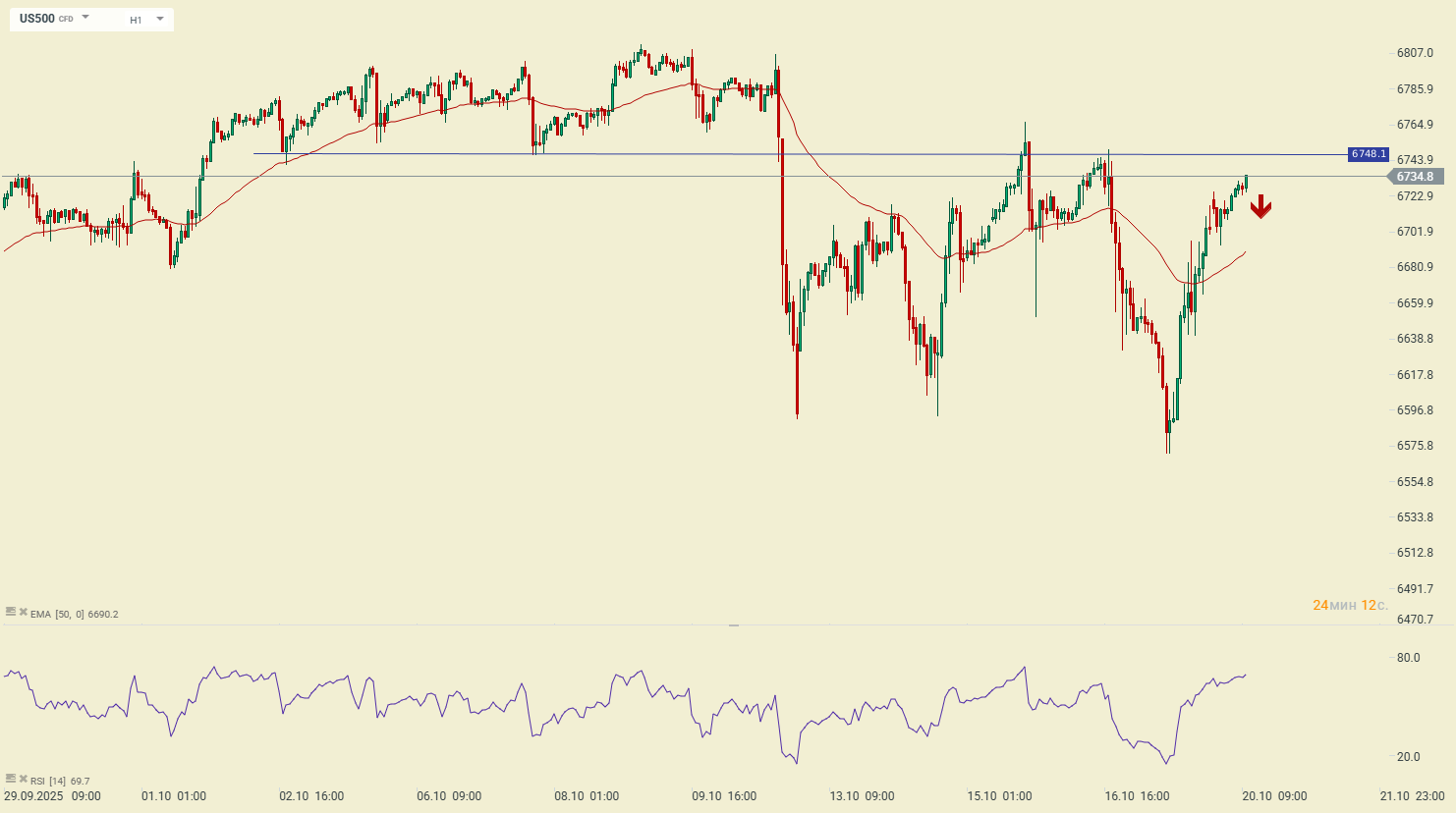 Фондовый индекс SP500 (US500) пробил ключевую поддержку на восходящем тренде и продолжает консолидироваться зеркально ниже уровня 6748, что указывает на приоритет продаж по данному индексу. Индикатор RSI находится вблизи зоны перекупленности, возможен отскок вниз. Исходя из этого, наша рекомендация по SP500 (US500): шорт ниже зеркального уровня сопротивления 6748, приоритетно с текущих ценовых показателей либо после локальной коррекции с ближайшей целью 6600 и ниже. Альтернативный сценарий: закрепление выше зеркального сопротивления 6748 будет означать продолжение трендового роста.