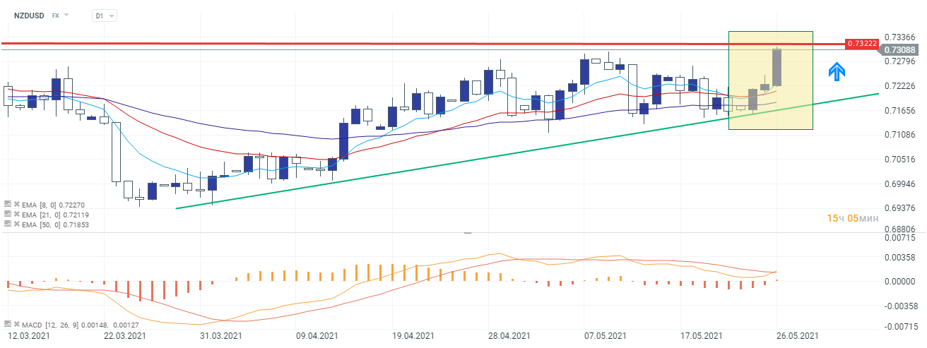 По состоянию на утро, 26 мая, ценовая отметка инструмента пребывает в диапазоне 0,7220-0,7315. Рассматриваем покупки только после пробития сформировавшегося сопротивления с последующей цены над уровнем. Рекомендованный риск на сделку 0,5-1%.