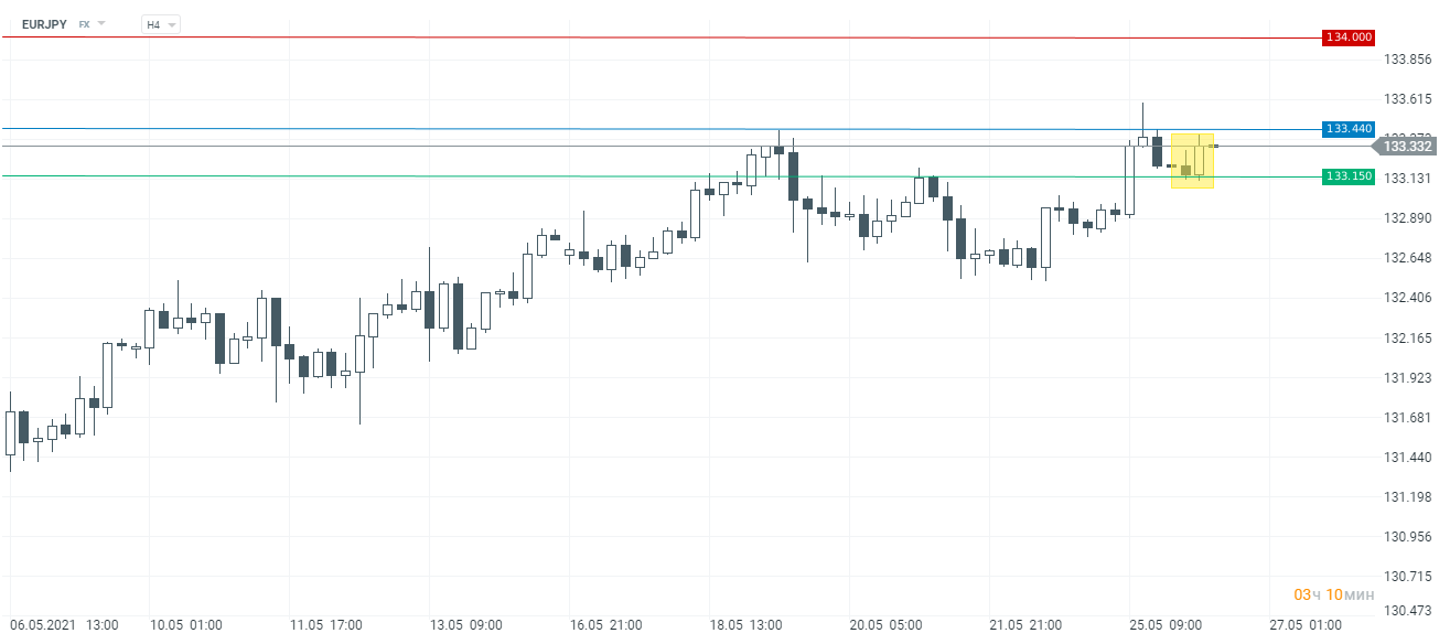 Вчера, валютная пара EUR/JPY скорректировалась к уровню 133.150, после чего была сформирована свечная формация поглощение. Рассматриваем дальнейшее движение по восходящему тренду, сделки открываем после пробития 133.44, ближайшая цель 134.00.