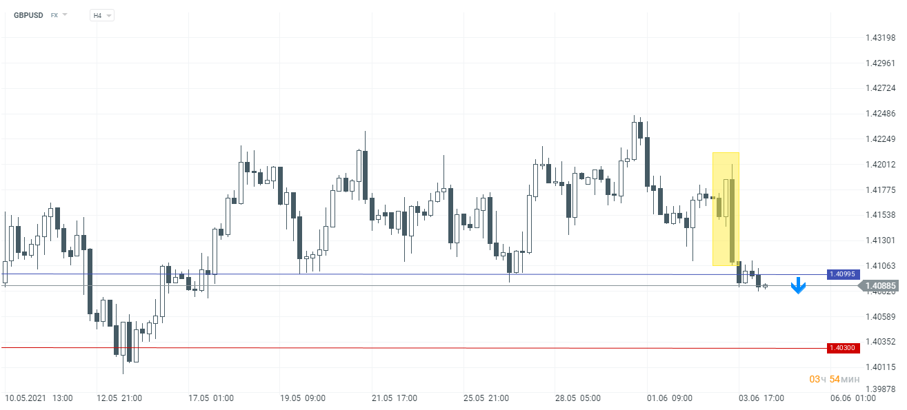 Вчера доллар США значительно вырос против основных валют, это связано с публикацией данных по занятости и активности в сфере услуг, которые оказались лучше ожиданий. ISM сообщил, что индекс деловой активности в сфере услуг вырос до 64.0 в мае, экономисты ожидали рост до 63.0. На графике H4 была сформирована свечная формация поглощение с последующим пробитием горизонтального уровня 1.4099. Рассматриваем сделки на продажу с текущих цен. Цель для снижения 1.4030.