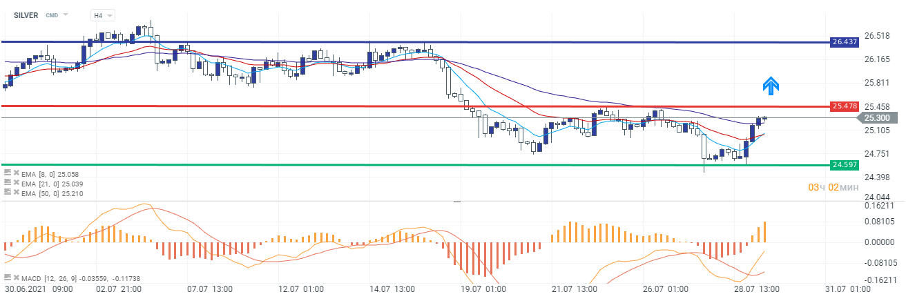По состоянию на утро 29 июля, ценовая отметка инструмента торгуется в диапазоне 25,23 - 25,31. Рекомендуем работать от покупок на пробой сформировавшегося канала. Риск на сделку 0,5-1%.