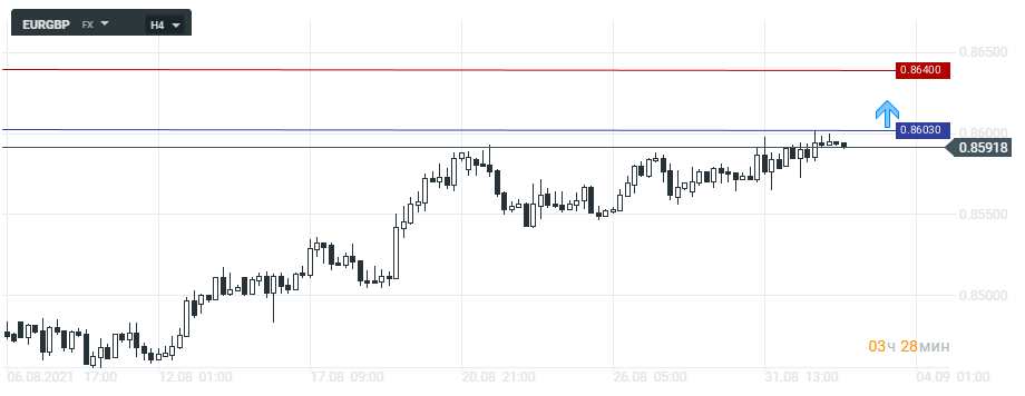 Рассматриваем дальнейший рост котировок и открываем сделки после пробития 0,8603. Цель для роста 0,8640.