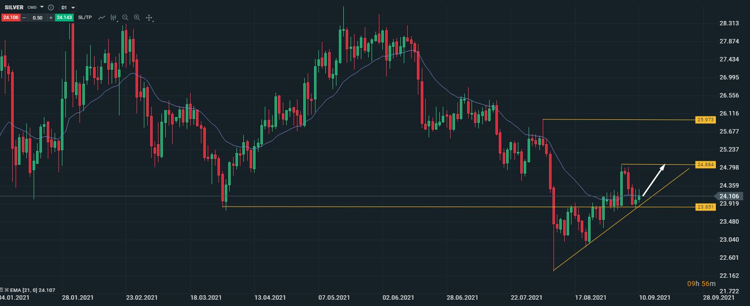 Техническая картина по серебру за последние два месяца набрала форму восходящего треугольника с довольно хорошим дневным накоплением, из которого ожидаем импульсный выстрел наверх. Удержание и реакция на сильную зону поддержки в диапазоне 23.800-24.000 служит тому подтверждением.