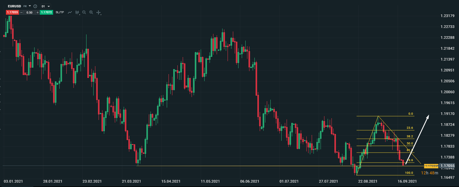 По валютной паре EUR/USD сформировалась глубокая коррекция в район 78,6% по Фибоначчи. Триггером для смены среднесрочного тренда является сильное импульсное движение по данной валютной паре, которое образовалось в конце августа. В данном импульсе движение вниз имеет характер коррекционного, что позволяет рассматривать возможность покупок. Глубина коррекции довольно сильная, что указывает на слабый сигнал для роста. Преградой для роста также является локальная нисходящая линия тренда, при сломе которой можно будет более уверенно говорить о покупках. Последняя надежда быков — это ключевой уровень поддержки 1.1700 (минимум марта и локальный минимум августа текущего года).