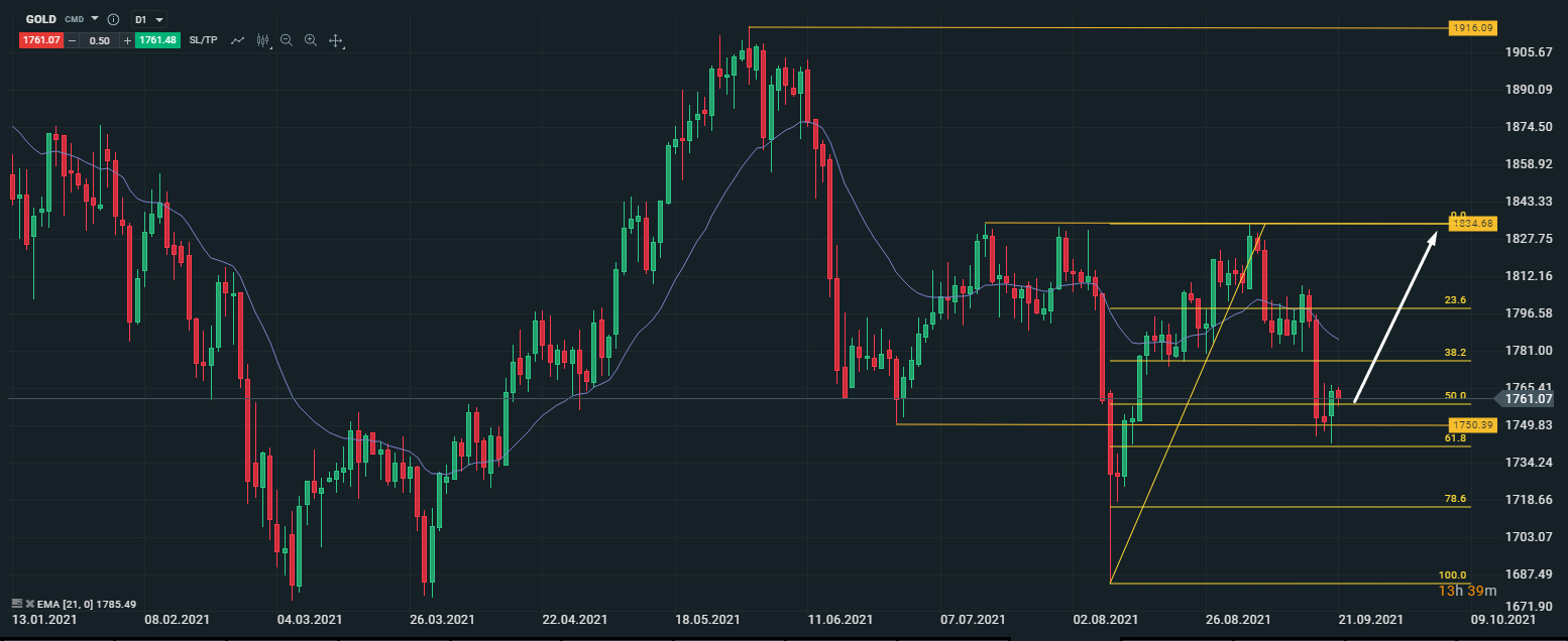По золоту (GOLD) сформировалась коррекция в район 61.8% по Фибоначчи. Триггером для смены нисходящего текущего тренда является сильный импульсный рост, который образовался в конце августа. В данном импульсе движение вниз имеет характер коррекционного, что позволяет рассматривать возможность для покупок. Ключевым уровнем поддержки для быков является также уровень 1750 (минимум июня текущего года, который совпадает с уровнем 61.8% по Фибоначчи).