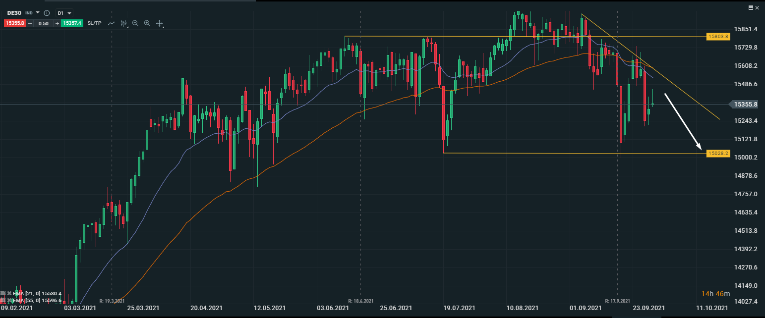 Технический анализ индекса DAX30 (40*): индекс закрепился ниже 21 средней скользящей и 55 средней скользящей, что дает нам основание говорить о возможном снижение. Сильные шортовые импульсы за последние две недели служат основным тригером продолжения нисходящей тенденции на пробой ключевой поддержки 15000.