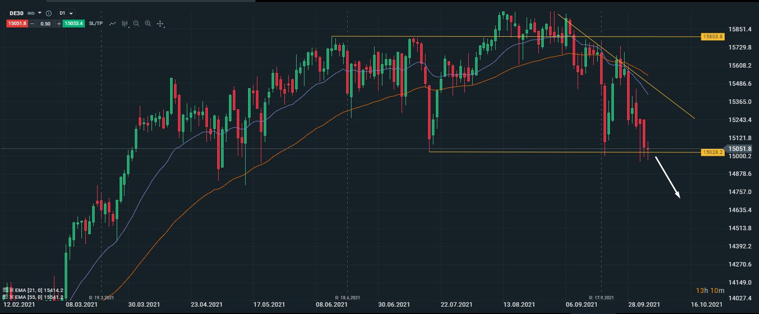 Технический анализ индекса DAX30: индекс продолжает торговаться ниже 21 и 55 средних скользящих, что дает нам основание говорить о силе медведей. О дальнейшем снижении говорят шортовые импульсные движения, которые образовались за последние несколько месяцев и служат основным триггером для смены долгосрочного тренда. Поскольку на графике индекса сформировался сильный уровень поддержки 15000, рассматривать шорты желательно после его пробоя.