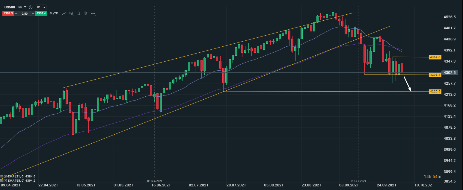 Технический анализ индекса SP500. Вчера рекомендовали рассматривать шорт ниже локальной зоны отката 4360. Вчера сделали ретест данной зоны, чем подтвердили медвежье настроение по индексу. Напомним, индекс продолжает торговаться ниже 21 и 55 средних скользящих, что дает нам основание говорить о силе продавцов. Основным тригером для дальнейшего снижения служит резкое импульсное движение вниз, которое образовалось за последние недели, а также формирование в этом импульсном движении отката с накоплением в виде шортового паттерна.