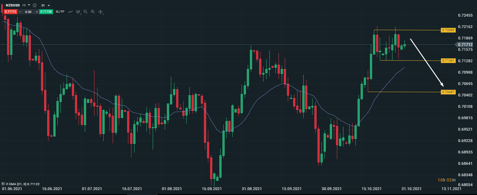 Техническая картина по NZD/USD. Медведи удерживают ключевой уровень сопротивления 0.7208. О снижении пары сигнализирует сформировавшаяся двойная вершина и шортовые импульсы от этой зоны.