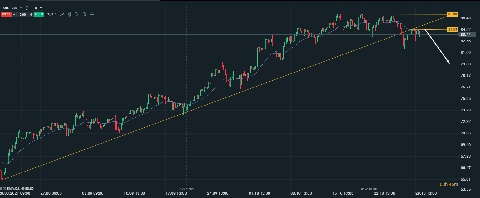 Техническая картина по нефти марки BRENT выглядит шортово. Как подтверждение этого рассматриваем 2 главных фактора: во-первых, медведи сломали восходящий тренд; во-вторых, цена закрепилась ниже 21 скользящей средней на 4-х часовом таймфрейме.