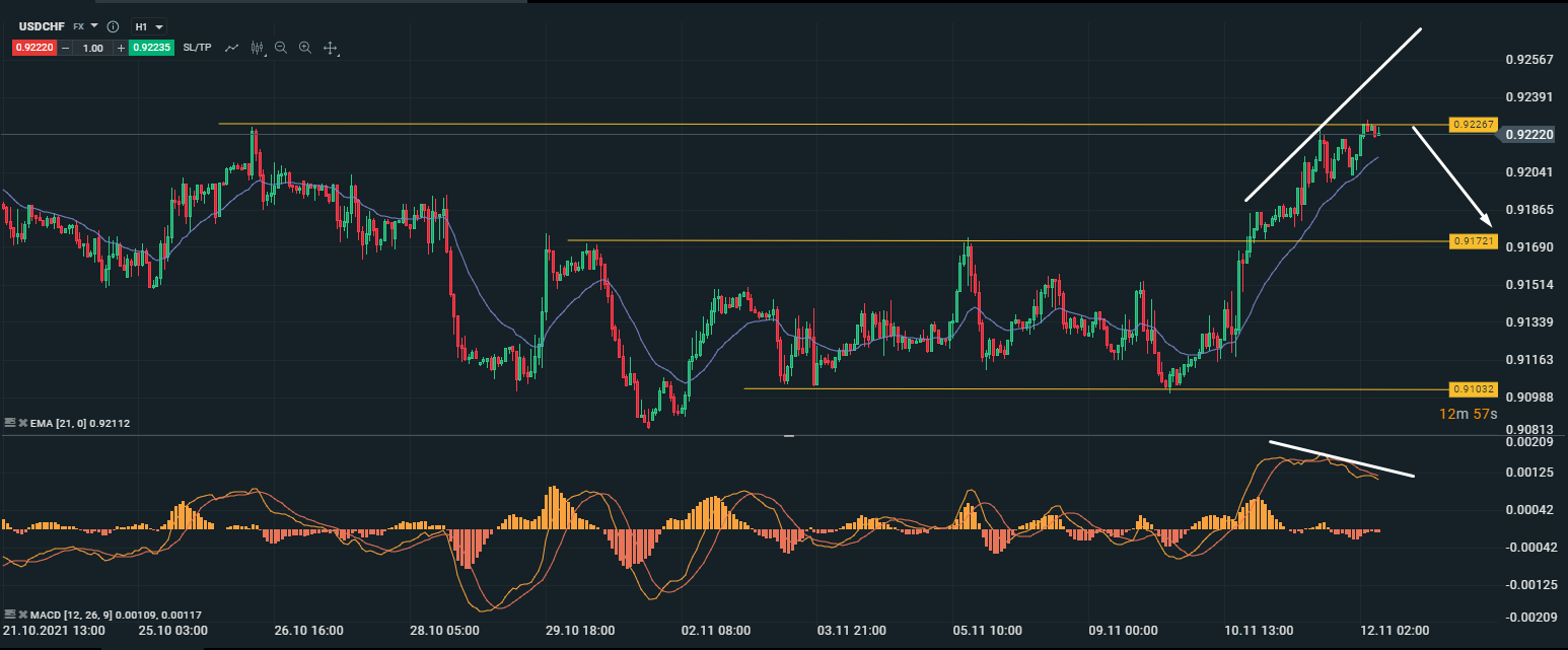 По валютной паре USD/CHF напрашивается коррекция. Как подтверждение этого рассматриваем 2 главных фактора: во-первых, быки уперлись в уровень сопротивления; во-вторых, наличие дивергенции на часовом таймфрейме.