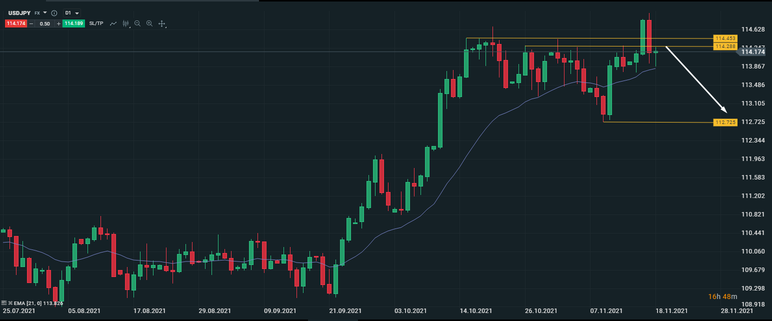 Техническая картина по валютной паре USD/JPY возможна смена тренда. Как подтверждение этого рассматриваем 2 главных фактора: во-первых, медведи сформировали ложный пробой ключевого уровня сопротивления 114.45; во-вторых, наличие дивергенции на дневном таймфрейме.