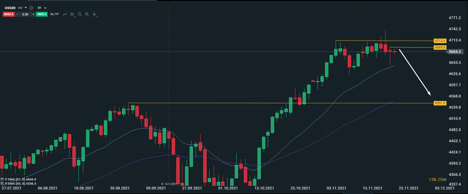 Техническая картина SP500 (US500). Медведи вчера сформировали откатный уровень 4695 и ранее ложный пробой ключевого уровня сопротивления 4712. Наличие дивергенции на дневном таймфрейме сигнализирует о возможной смене восходящей тенденции.