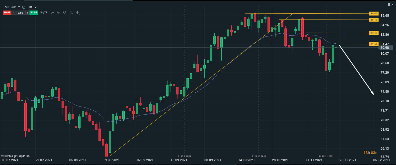 Техническая картина по нефти марки BRENT. Идет зарождение нового нисходящего среднесрочного тренда. Как подтверждение этого рассматриваем 2 главных фактора: во-первых, медведи сломали восходящий тренд сильными импульсами вниз и сформировали откатную зону 81,50; во-вторых, цена закрепилась ниже 21 скользящей средней на дневном таймфрейме.