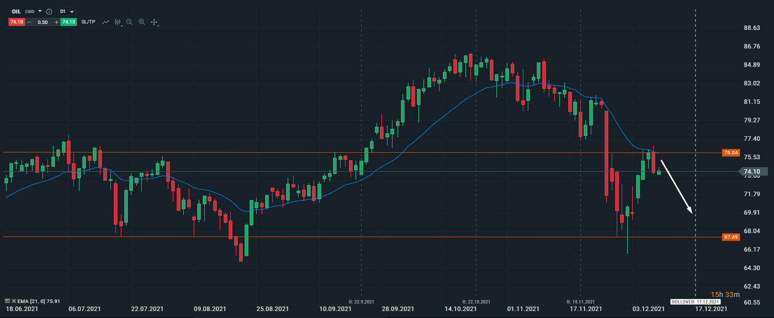 Альтернативный сценарий: при закрытии дневной свечи выше 76,00 (и 21 средней скользящей на дневном таймфрейме) открываются перспективы для роста.