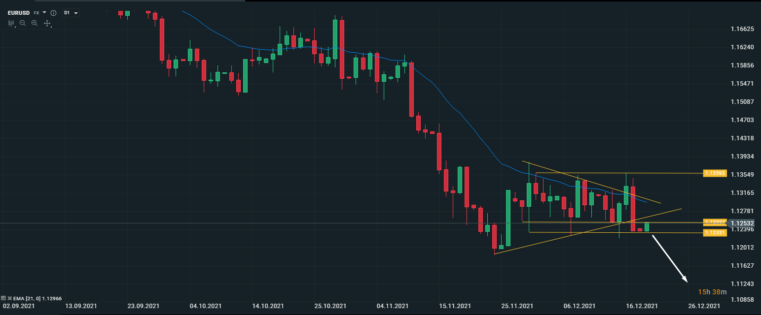 Техническая картина по EUR/USD. Медведи в пятницу смогли пробить нижнюю границу треугольника, но быки смогли удержать ключевой уровень поддержки 1,1220 (лоу откатной зоны), это указывает на силу продавцов.
