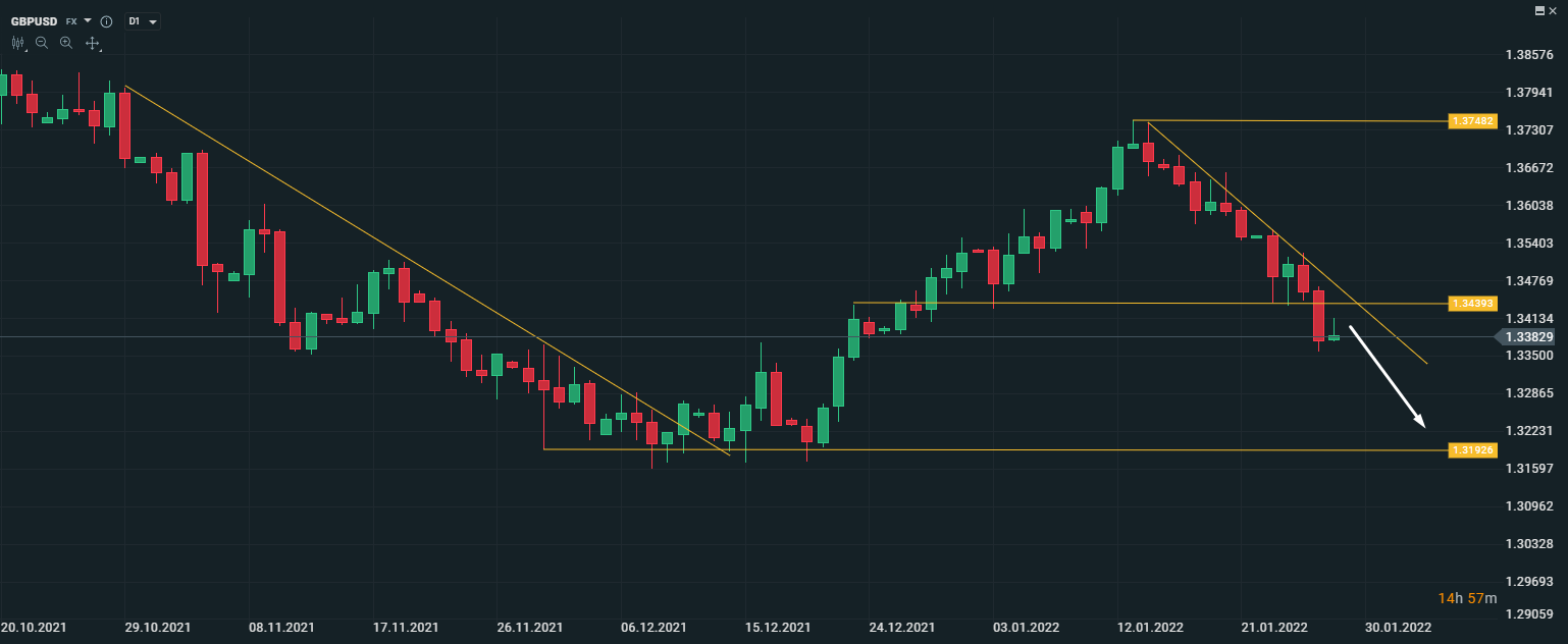Техническая картина по GBP/USD. Медведи вчера закрепились ниже ключевого уровня поддержки 1,3440. Данный фактор указывает на силу медведей в целевом диапазоне и явный локальный нисходящий тренд.