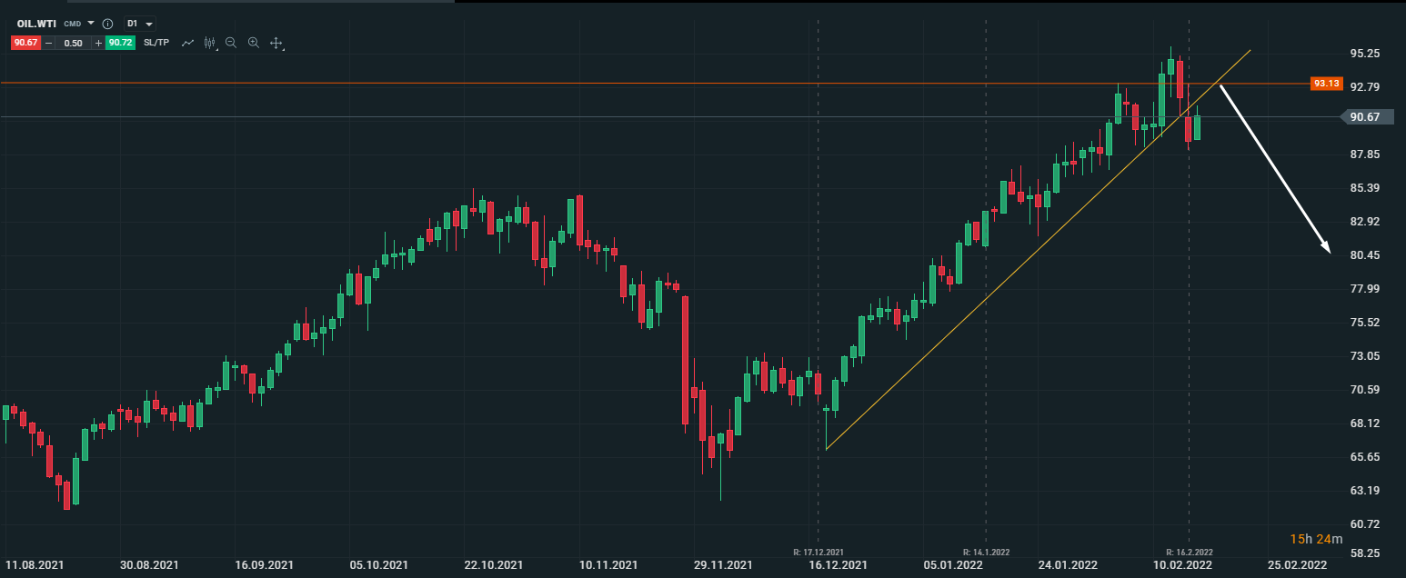 Техническая картина по OIL (WTI). Вчера медведи сломали восходящую трендовую линии, что сигнализирует о возможной смене тренда. Также на дневном таймфрейме присутствует дивергенция, что говорит о перекупленности.