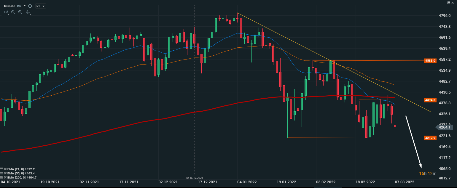 Техническая картина по SP500 (US500). Медведи продолжают удерживать нисходящий локальный тренд, а также 21-55-200 средние скользящие, что сигнализирует о медвежьем рыночном сентименте.
