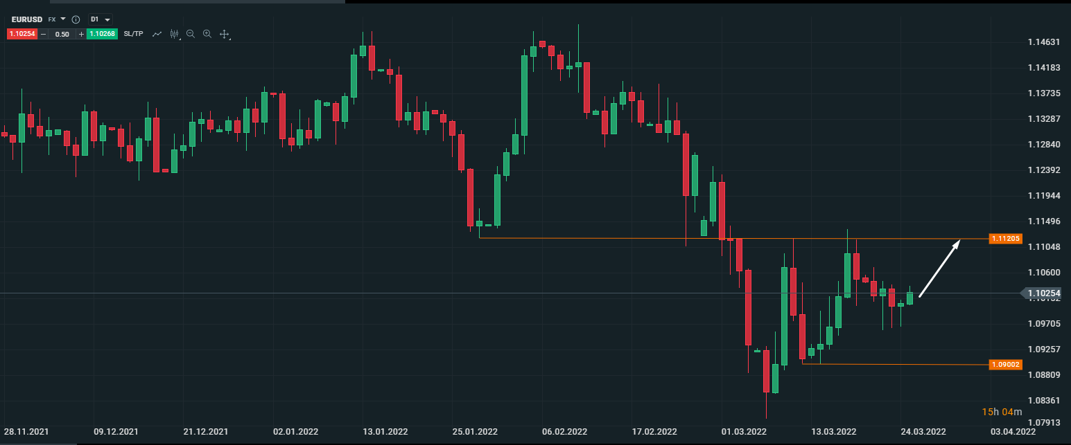 Техническая картина по EUR/USD. Вчера быки ушли вверх локальным импульсом от откатного локального уровня поддержки 1.0965 в ключевом дневном импульсе от 8-9.03.022, что сигнализирует о возможном росте пары до уровня 1.1120.