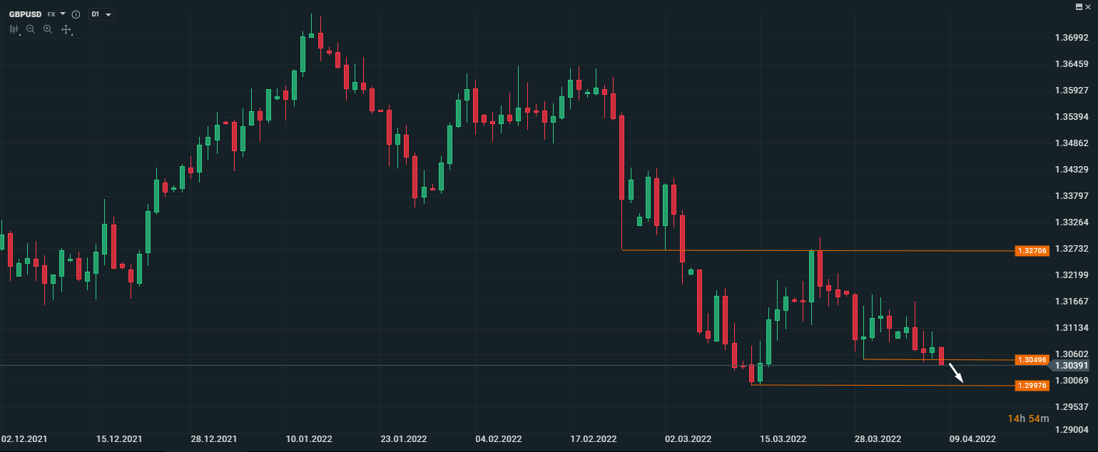 Техническая картина по GBP/USD. На текущий момент медведи прорвали ключевой откатный уровень поддержки 1.3050, что являться сигналом на снижение пары до уровня 1.3000.