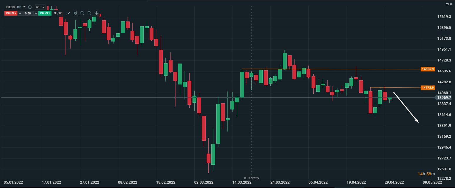 Исходя из этого, наша рекомендация по DE30: шорт ниже 14172 с целями 13600-12500.