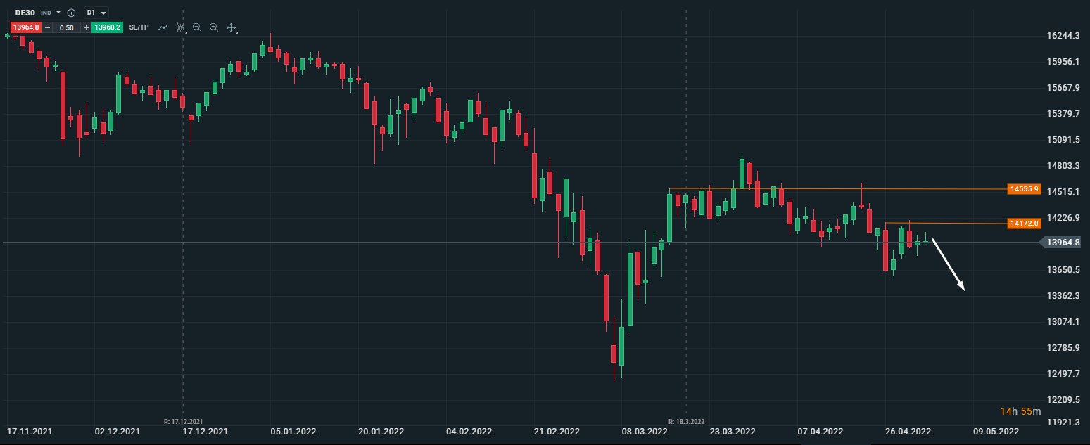 Исходя из этого, наша рекомендация по DE30: шорт ниже 14172 с целями 13600-12500.