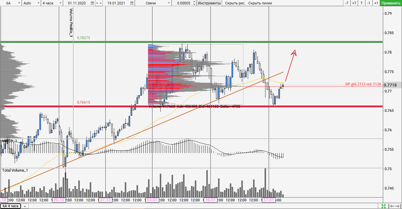 По состоянию на утро 19 января, ценовая отметка по инструменту торгуется в диапазоне 0,7709-0,7724. Рассматриваем покупки. Вход в рынок после фиксации цены над уровнем сопротивления.