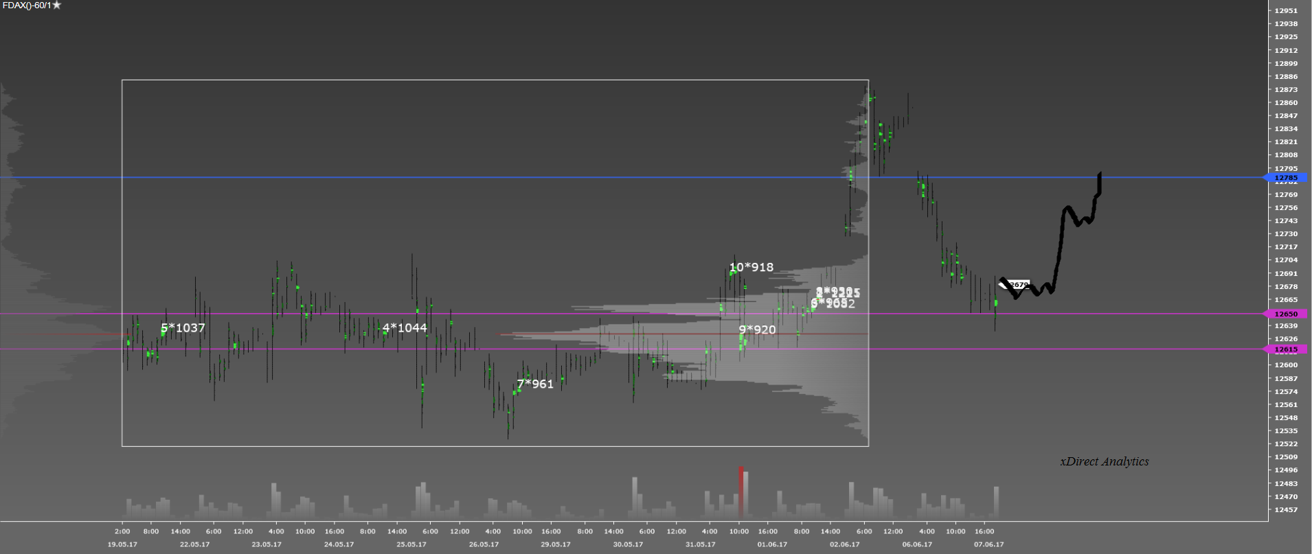 Стоит отметить значительное накопление объема в диапазоне 12650 – 12615, что и является ключевой поддержкой на текущий момент. Вероятнее всего именно в этом диапазоне покупатели открывали свои позиции, которые в дальнейшем и толкнули цену вверх.