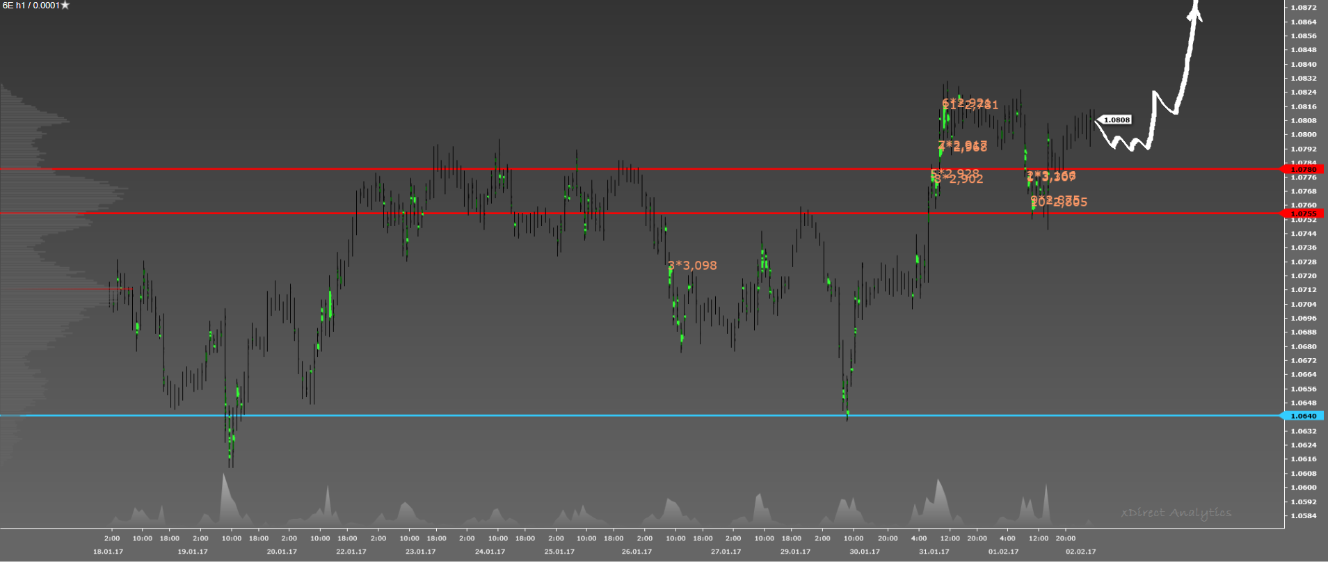 Стоит отметить ключевой уровень поддержки покупателей – 1,0780 – 1,0755 (forex 1.0760 – 1.0735). Рекомендация на сегодня – покупка с установкой стоп приказа под данный уровень. Обращаем ваше внимание, что пробой данного уровня поддержки вниз – полностью отменит сценарий дальнейшего роста цен на данный актив.