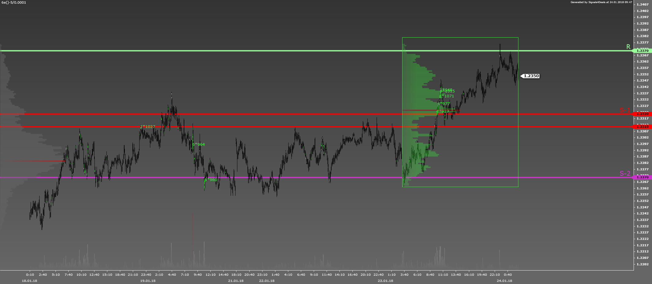 - ключевая объёмная поддержка покупателей S-1 1.2320 – 1.2310 – пробой уровня с фиксацией на объеме. Данный уровень сформировал лонговый дисбаланс. В случае ухода цены вниз, нас ожидает снижение к 1,2270;