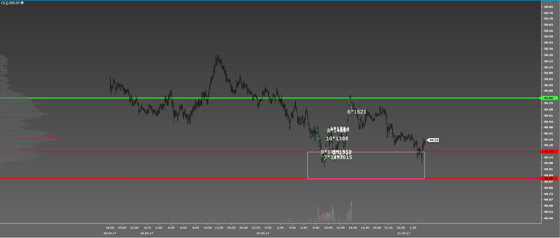 На фоне недавнего сильного снижения стоимости нефти в последние дни мы наблюдали восходящую коррекцию. Вчера появились первые признаки окончания данной коррекции. Важно понимать, что с текущих цен продавать еще рано, лучше дождаться пробоя ключевой поддержки покупателей и после этого открывать шорты. Так, ключевая объемная поддержка находится в ценовом диапазоне 49,20 – 48,90. При пробое данного уровня на объеме вниз – открываем продажи. Сопротивление в данном случае находится на отметке 49,80. Уход и фиксация цены выше данной отметки обозначит силу покупателей и откроет нам возможность рассматривать покупки в ближайшие дни.