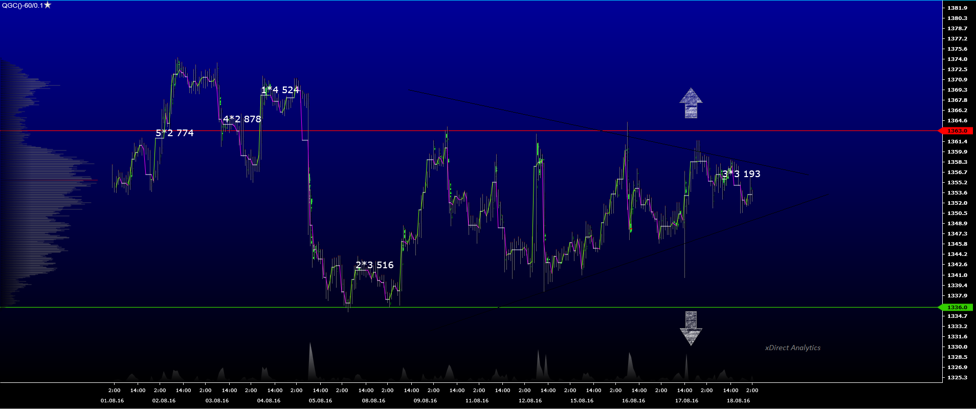 С начала августа золото торгуется в узкой консолидации 1360 – 1330 (цена спот форекс). Это свидетельствует о том, что баланс на рынке – нейтральный. Основная масса участников рынка ожидает пробоя данного диапазона, чтобы работать в ногу с трендом.