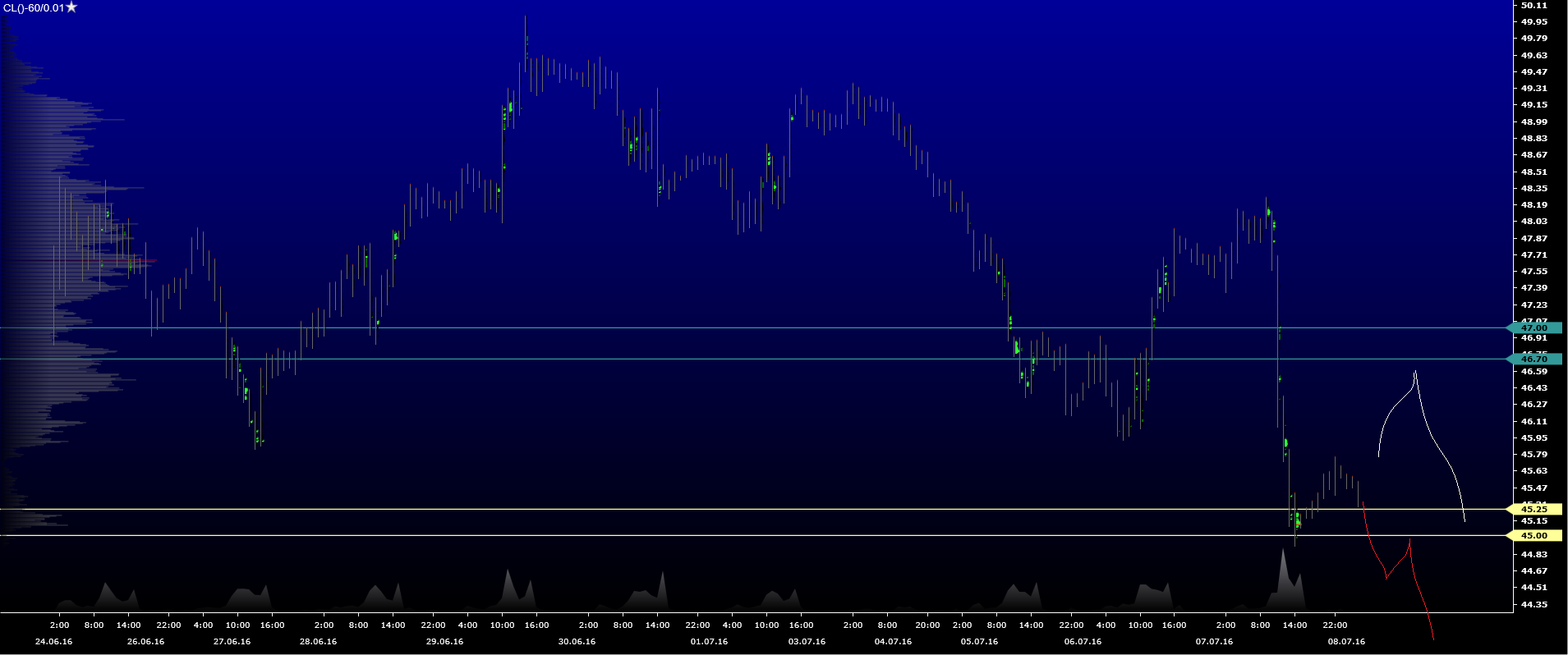 Вчера нефть на новостях продемонстрировала значительное снижение и при таком исходе событий приоритетом для нас на сегодня являются продажи. Стоит рассмотреть два основных сценария возможных продаж. Первый – при коррекции к уровню 47,00 – 46,70 (стоп в этом случае надо ставить 48,15). Второй вариант продажи – при пробое вниз уровня поддержки 45,25 – 45,00 (в этом случае стоп лосс нужно прятать за 45,90).