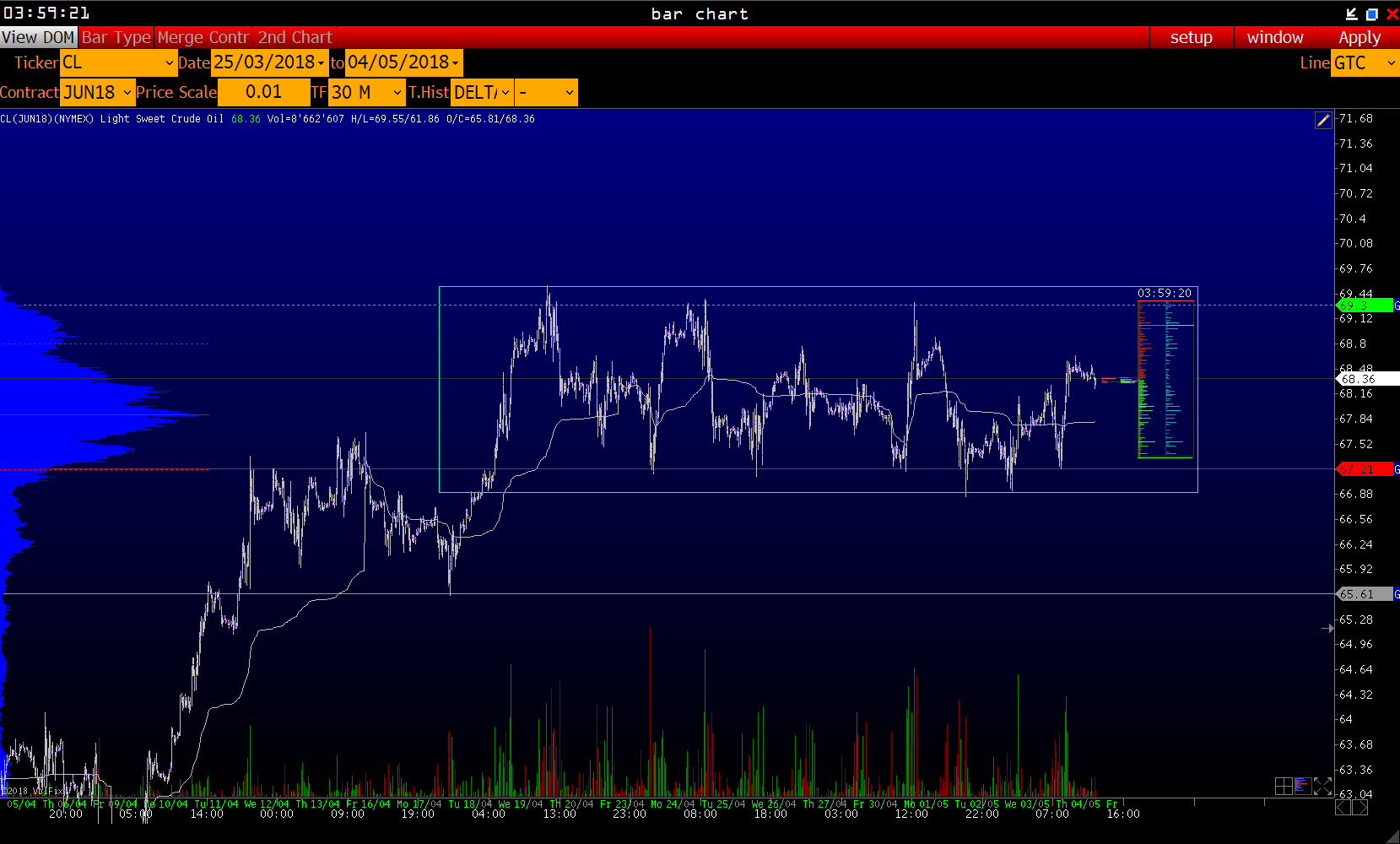 Нефть продолжает консолидироваться в узком диапазоне 69,30 – 67,20. Обратите внимание на профиль рынка, который демонстрирует значительное накопление объема в данном диапазоне. Пробой волатильности даст возможность рынку перейти в среднесрочную стадию тренда, на которой и рекомендуем работать. Также есть возможность работы от границ диапазона с коротким стоп приказом от локальных импульсных объемов.