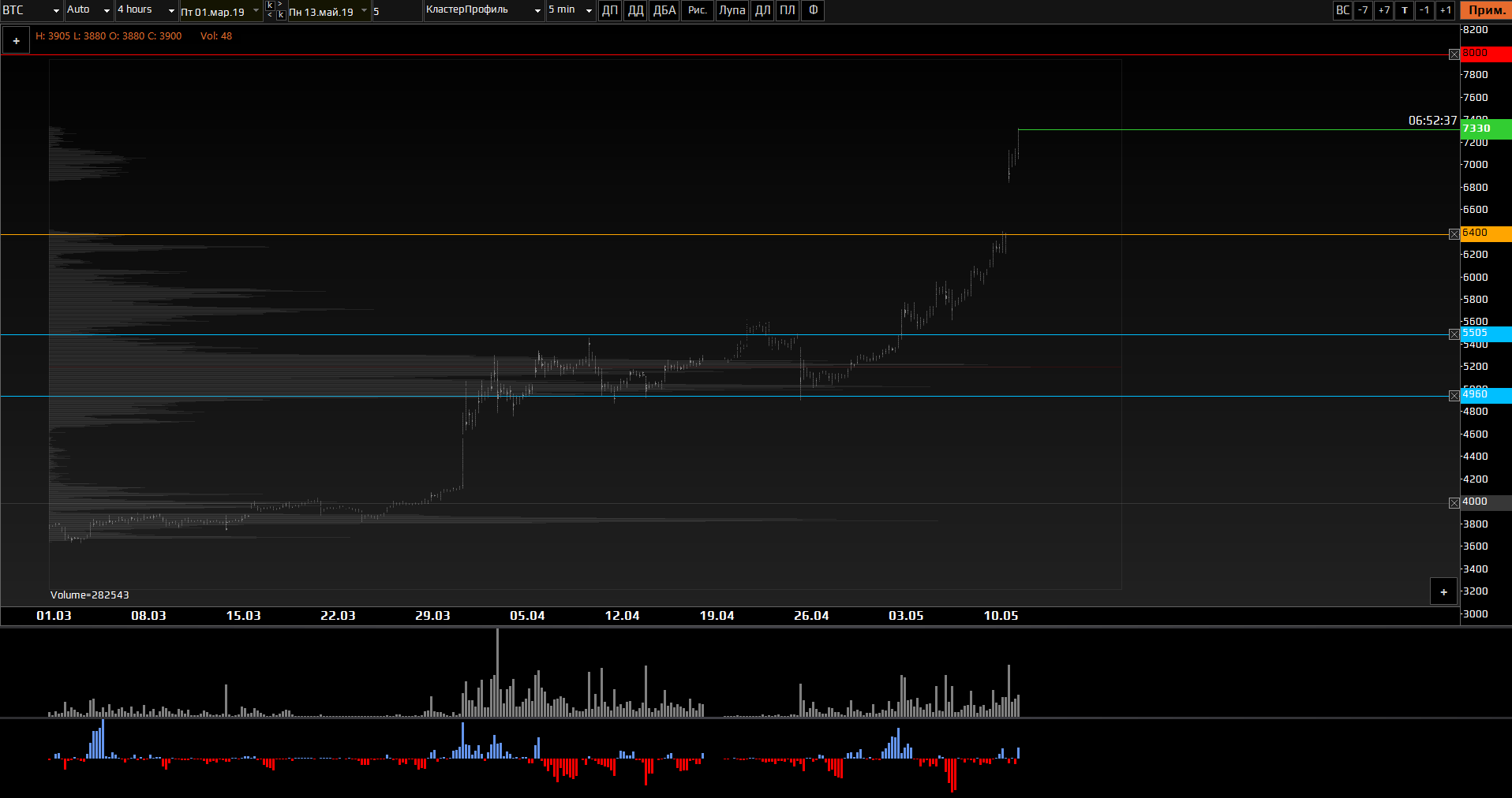 Цена на Биткоин продолжает стремительно расти. В понедельник биржа СМЕ открылась огромным гэпом с отметки 6400 на фьючерсах BTC. В данной ситуации мы видим высокую вероятность продолжения роста и взятие покупателями отметки 8000 в ближайшее время. Ключевой диапазон скопления обьемов – 5500 – 4960!