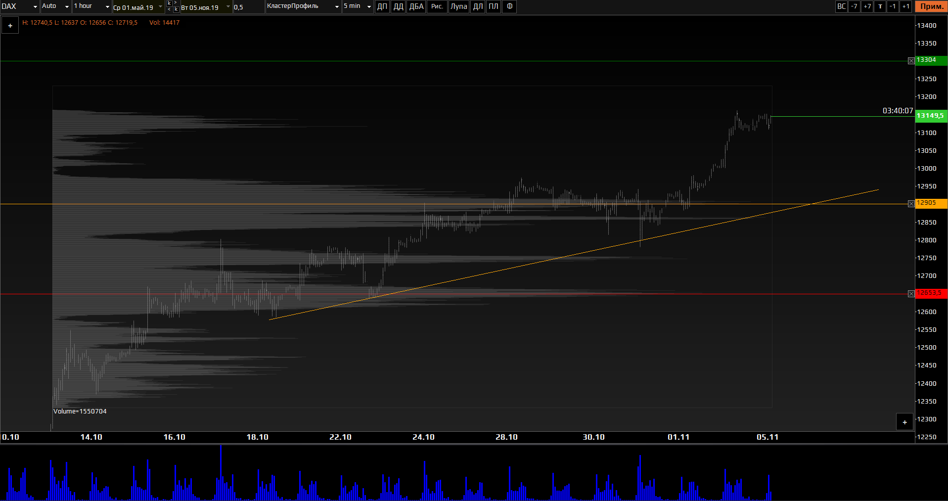 Фондовые индексы продолжают испытывать позитив от вливания центробанками ликвидности в экономику и позитива по торговой войне и Брекзит. Так, немецкий Дакс торгуется выше отметки 13000. Ключевые объемные уровни – это поддержки 12905 и 12650, а также сопротивление 13300. Мы ожидаем продолжение роста котировок с целью теста указанного сопротивления.