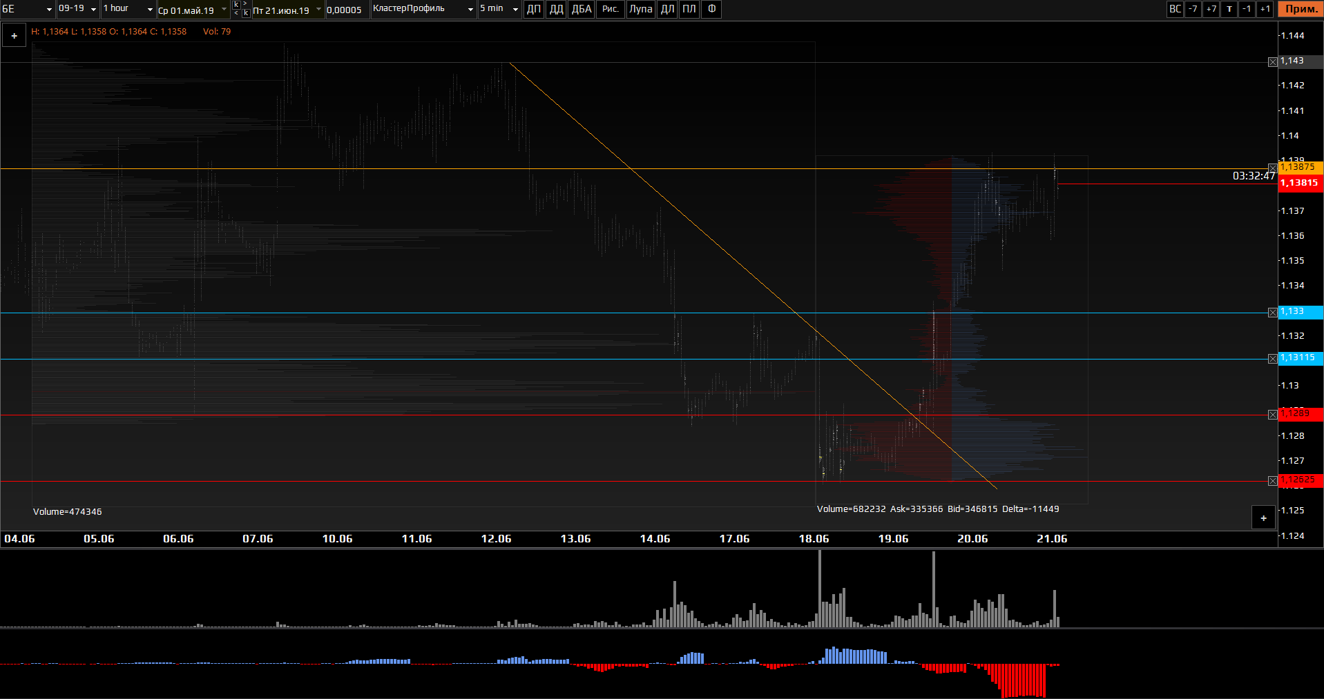 Мы видим прогнозируемый рост котировок по евродоллару. Стоит выделить ключевую зону накопления обьема 1,1289 – 1,1262, а также объемный диапазон, который был сформирован в результате FOMC 1,1330 – 1,1311. Мы видим дальнейший потенциал роста котировок с целевой отметкой 1,1430. Для внутридневных трейдеров рекомендуем обратить внимание на локальное объемное сопротивление 1,1387!