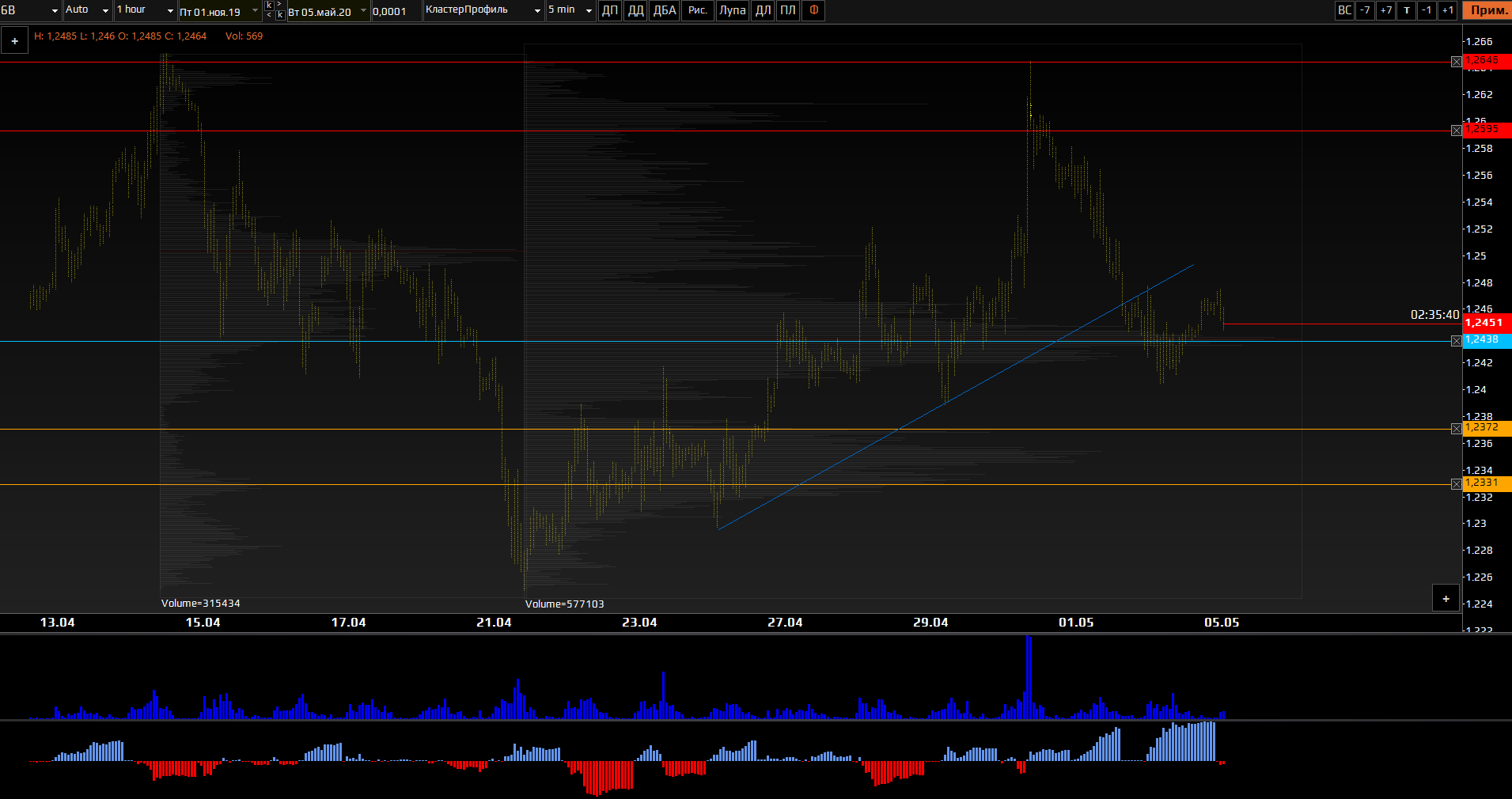 Восходящий тренд GBPUSD подходит к концу. Уровень сопротивления 1,2646 - 1,2595 уверенно сдерживает попытки покупателей продавить цену выше. Мы видим потенциал дальнейшего снижения данной валютной пары. Стоит внимательно следить за обьемными уровнями 1,2438 и 1,2372 - 1,2331.