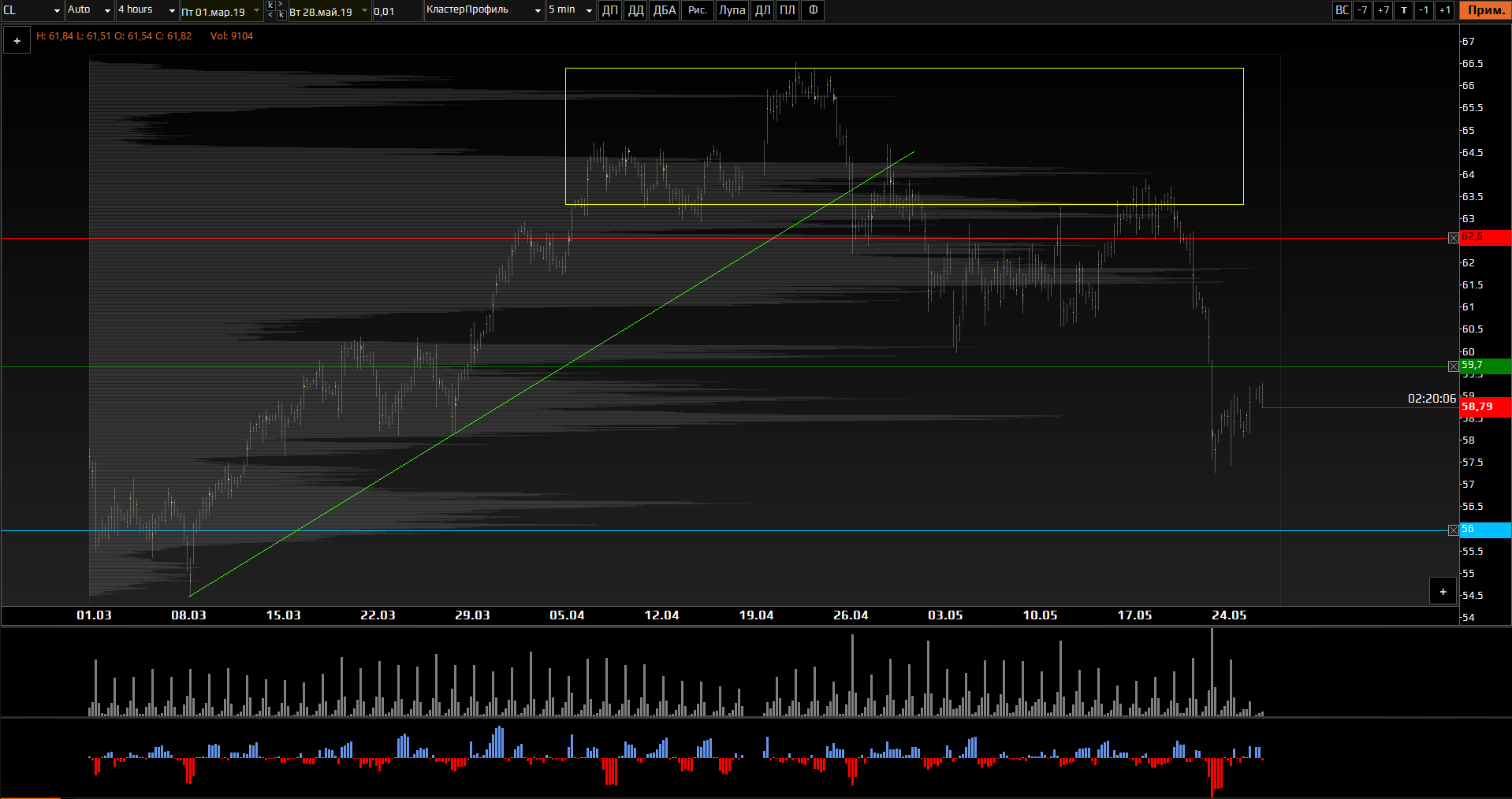 Согласно объёмной теории Вайкоффа в желтом прямоугольнике на графике произошла разгрузка позиций участников рынка и в итоге мы увидели разворот тенденции. Потенциал дальнейшего падения к целевой отметке 56,00 сохраняется. Стоит отметить, что ключевое сопротивление находится в районе отметки 62,60, при этом локальное сопротивление расположено на отметке 59,70.
