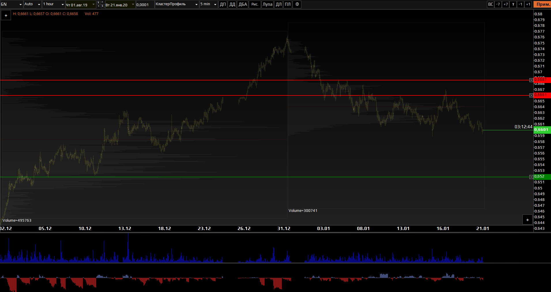 Новозеландский доллар продолжает торговаться под постоянным давлением продавцов. Любые попытки роста мгновенно упираются в сопротивление продавцов. Стоит отметить, что ключевой диапазон обьемного сопротивления находится в зоне 0,6687 – 0,6661. Мы ожидаем дальнейшее снижение инструмента с целевой отметкой 0,6520, где сконцентрировано множество обьемов покупателей, который участвовали в предыдущем восходящем тренде.