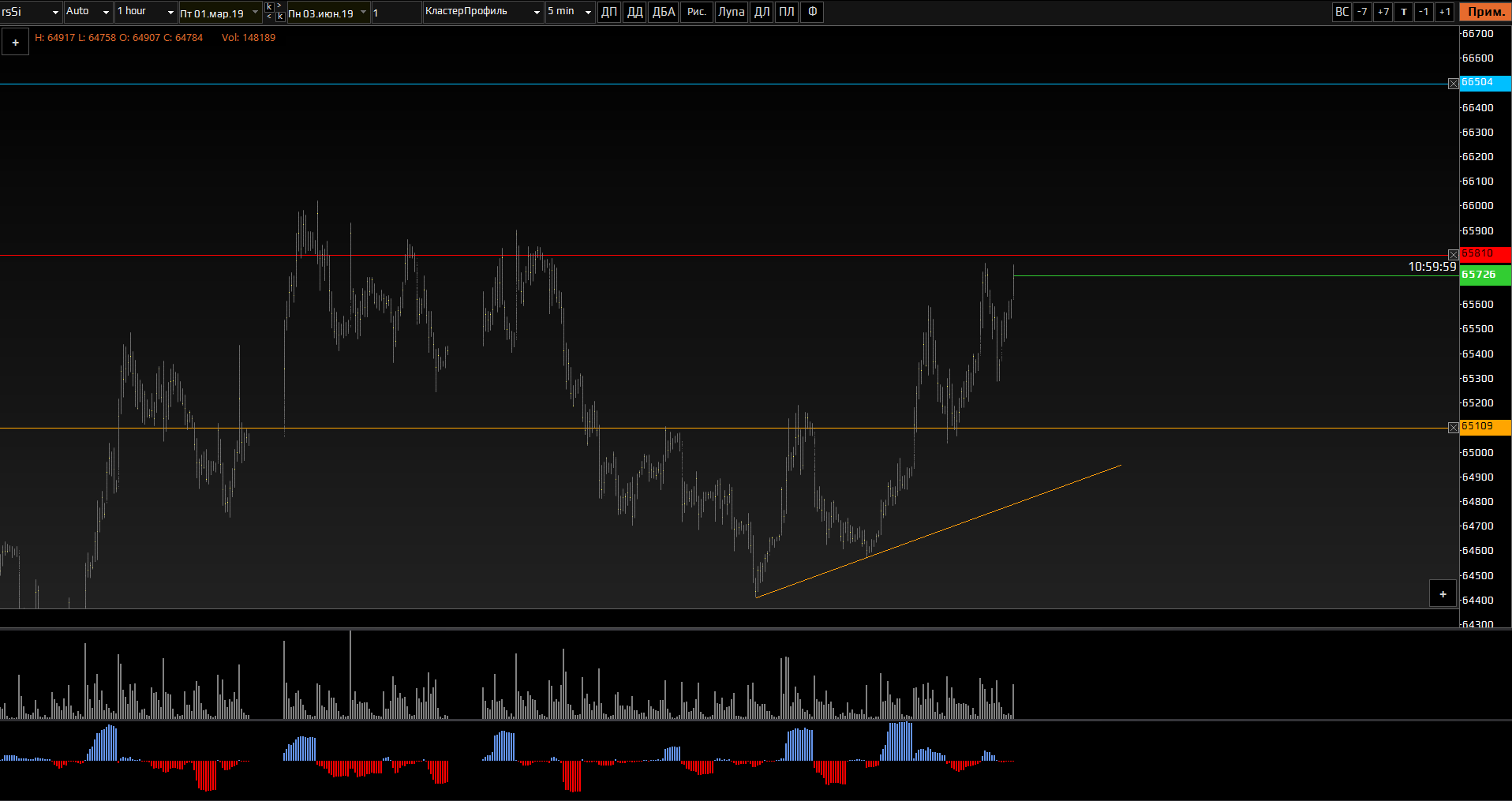 В условиях стресса на глобальных финансовых рынках валюты emerging markets испытывают сильное давление. Рубль не стал исключением, так валютный фьючерс Si USDRUB значительно вырос с конца Мая. Стоит отметить ключевую поддержку инструмента на уровне 65100, а также сопротивление 65810, под которым сейчас и торгуется цена, готовясь к пробою. В случае пробоя цена может импульсно дорасти до уровня 66500.