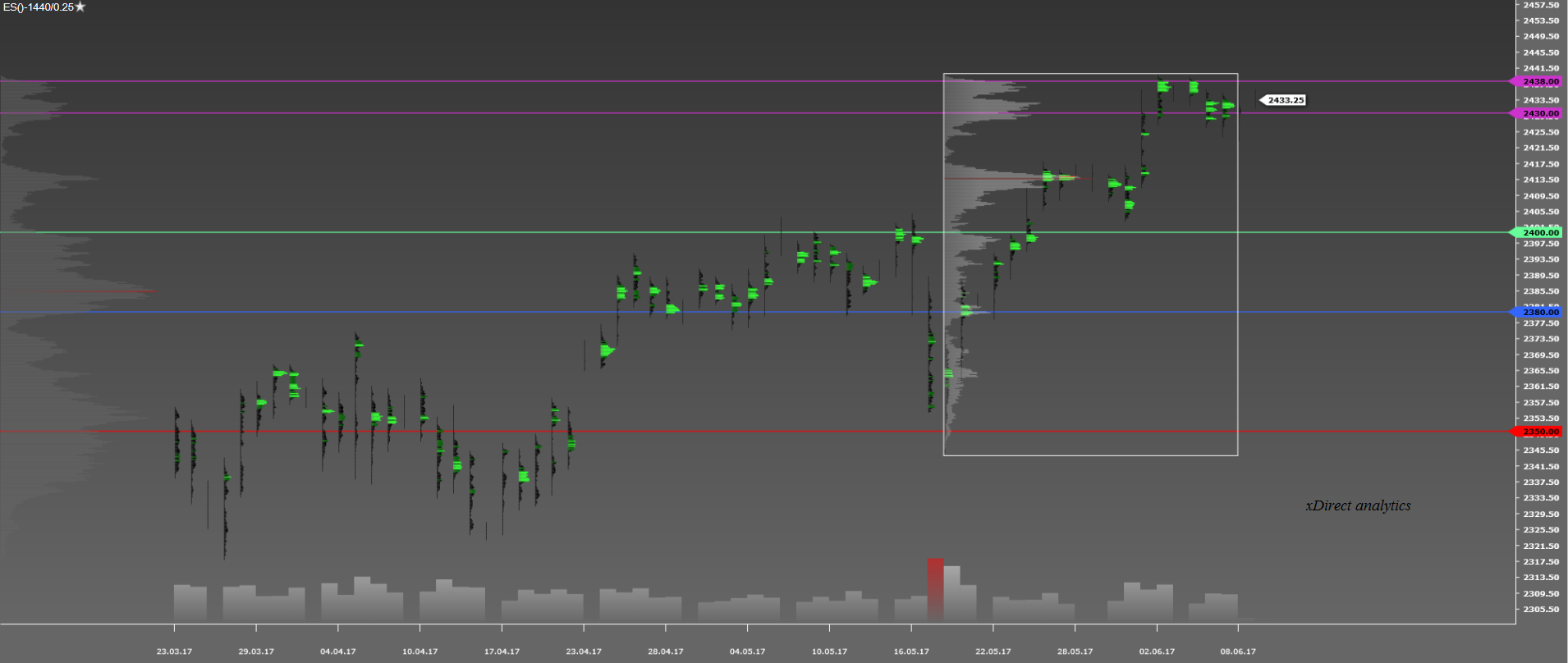 Стоимость фондовых индексов явно «перегрета». В рынок не заходят новые позиции, а ликвидность явно свидетельствует о разгрузке лонгов. В результате, мы можем увидеть в скором времени значительную коррекцию S&P500. В моменте сформирован объемный уровень 2438 – 2430. Так, снижение и фиксация цены под данным уровнем и будет сигналом к продажам. Первой отметкой и поддержкой цены выступит отметку 2400, а последующей поддержкой будет отметка 2380. В случае падения цены ниже данных отметок, мы можем увидеть даже обвал цены к отметке 2300.