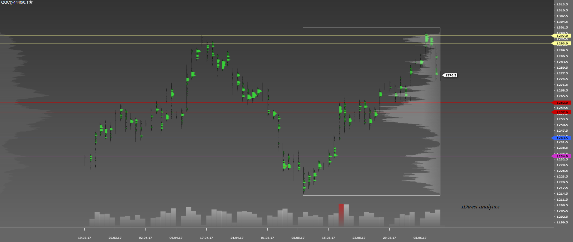 С начала мая золото имело устойчивую тенденцию к росту, но на этой неделе после ложного пробития предыдущего пика был сформирован значительный уровень объемного сопротивления 1297 – 1293, после чего цена уверенно пошла в нисходящую коррекцию. Стоит отметить, что падение имеет потенциал до уровня поддержки покупателей 1262 – 1257. В случае пробоя данной поддержки мы увидим снижение к последующим поддержкам 1243 и 1234.