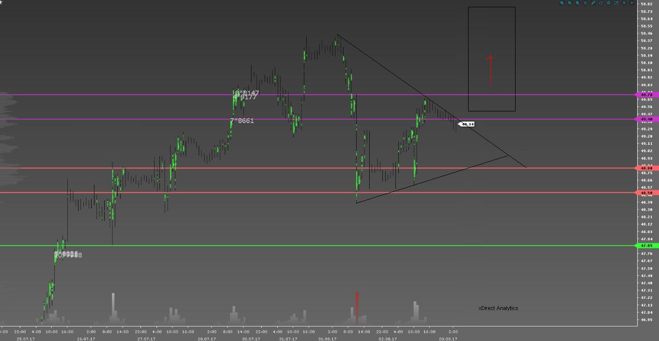 Анализ фьючерса на нефть явно указывает на повышение объемов при росте цены, а также импульсный рост после снижения к уровню 48,80 – 48,50 на выходе данных о запасах нефти в США вчера. Данная ситуация указывает на повышенный спрос к покупкам данного актива.